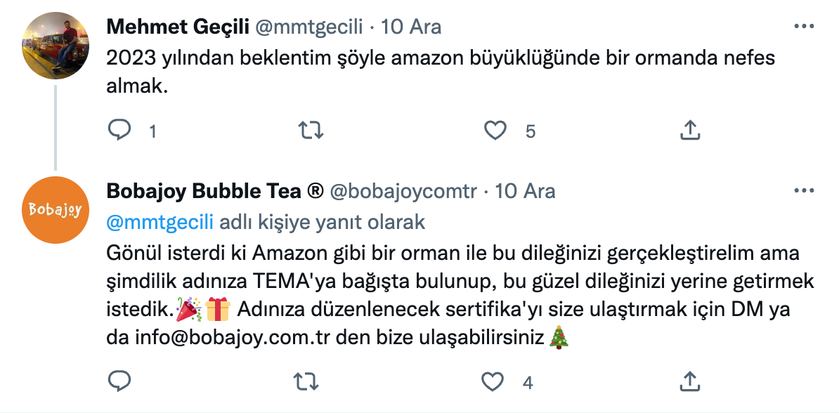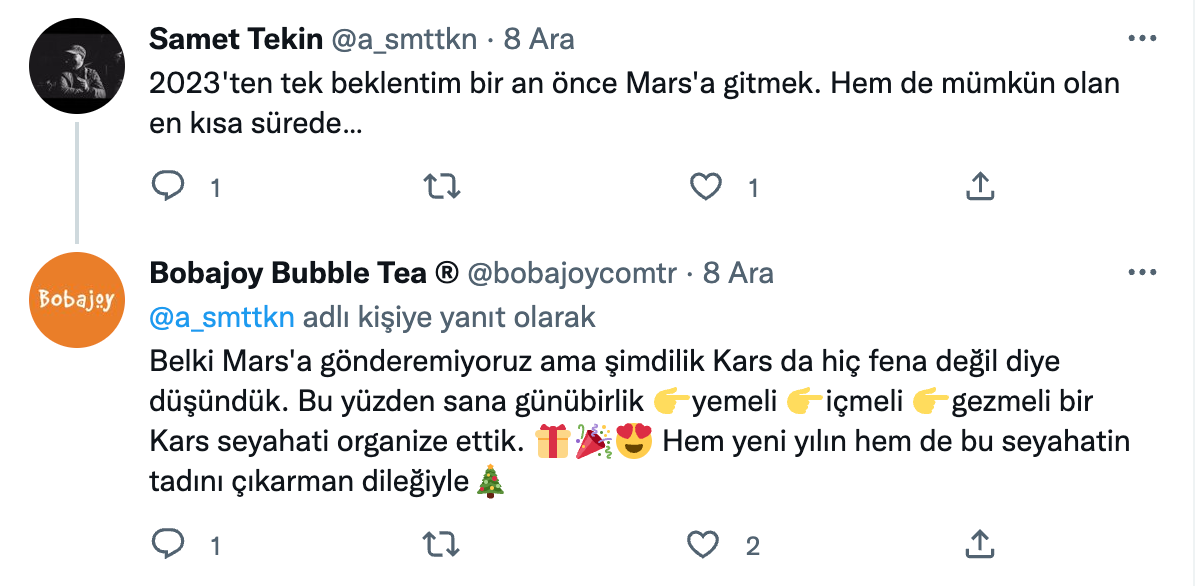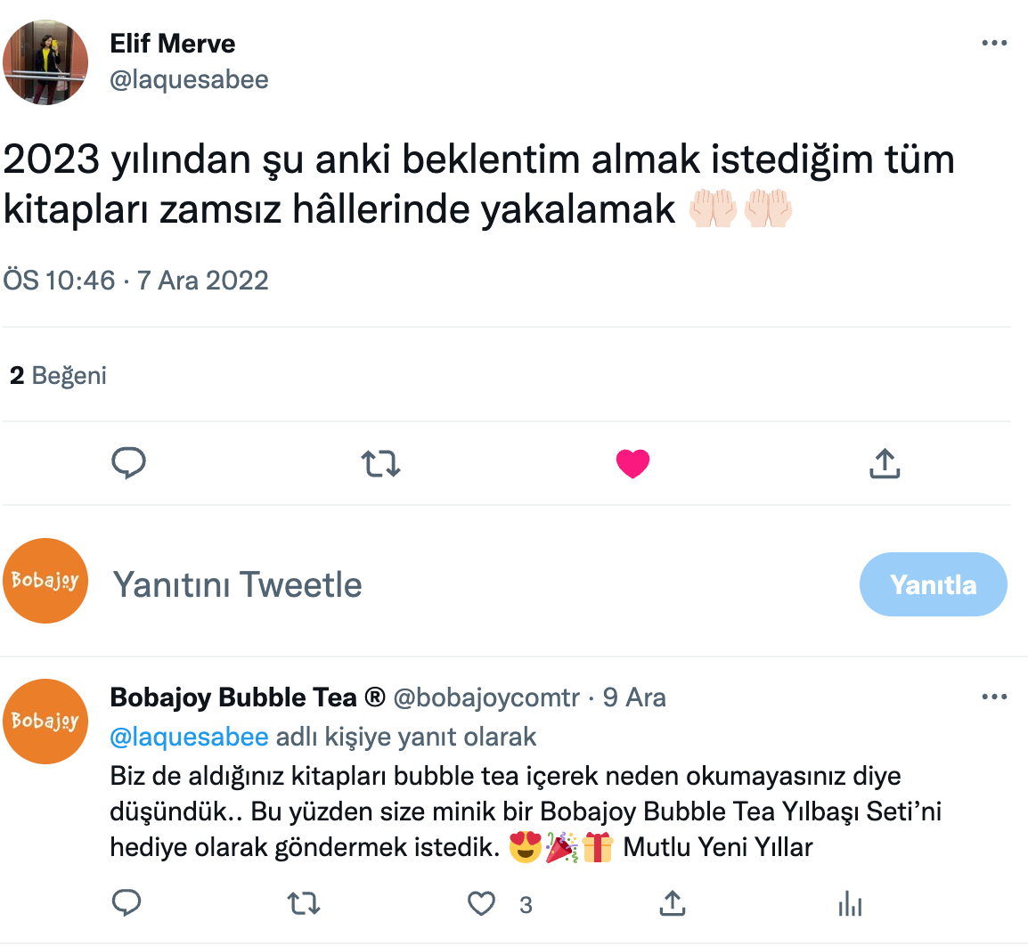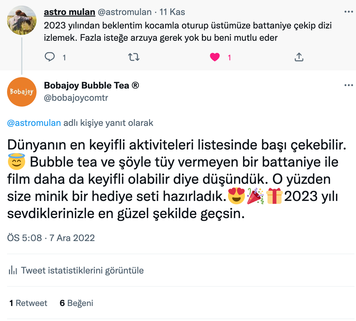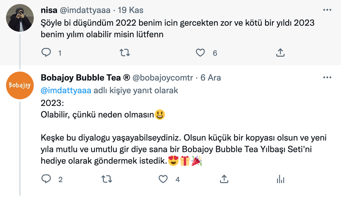 Twitter’da son bir yılda 2023 yılına dair beklenti ve hayallerini tweet’leyen binlerce kullanıcıyı bulduk ve rastgele seçilmiş 100 kullanıcıya yaratıcı mention’lar gönderdik.