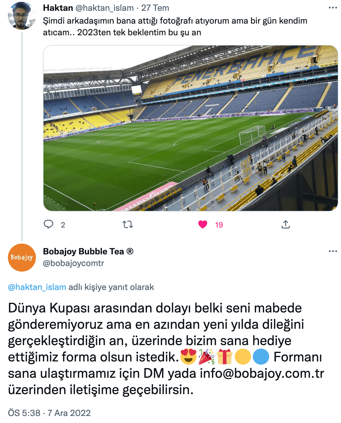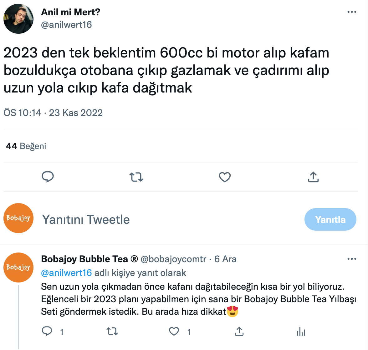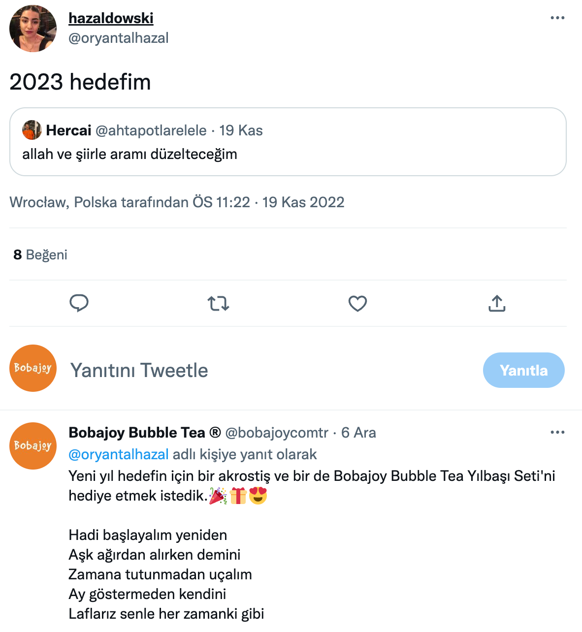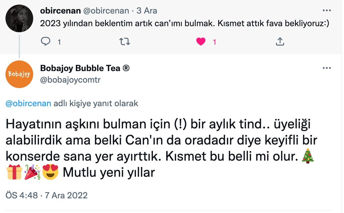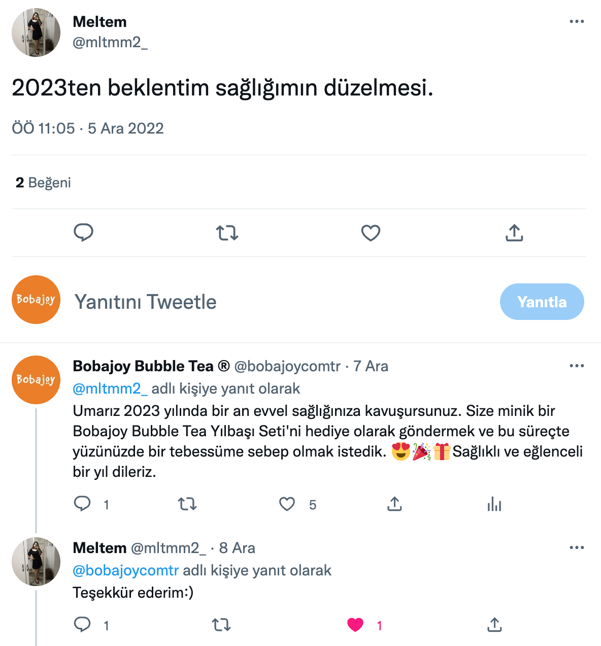 Twitter’da son bir yılda 2023 yılına dair beklenti ve hayallerini tweet’leyen binlerce kullanıcıyı bulduk ve rastgele seçilmiş 100 kullanıcıya yaratıcı mention’lar gönderdik.